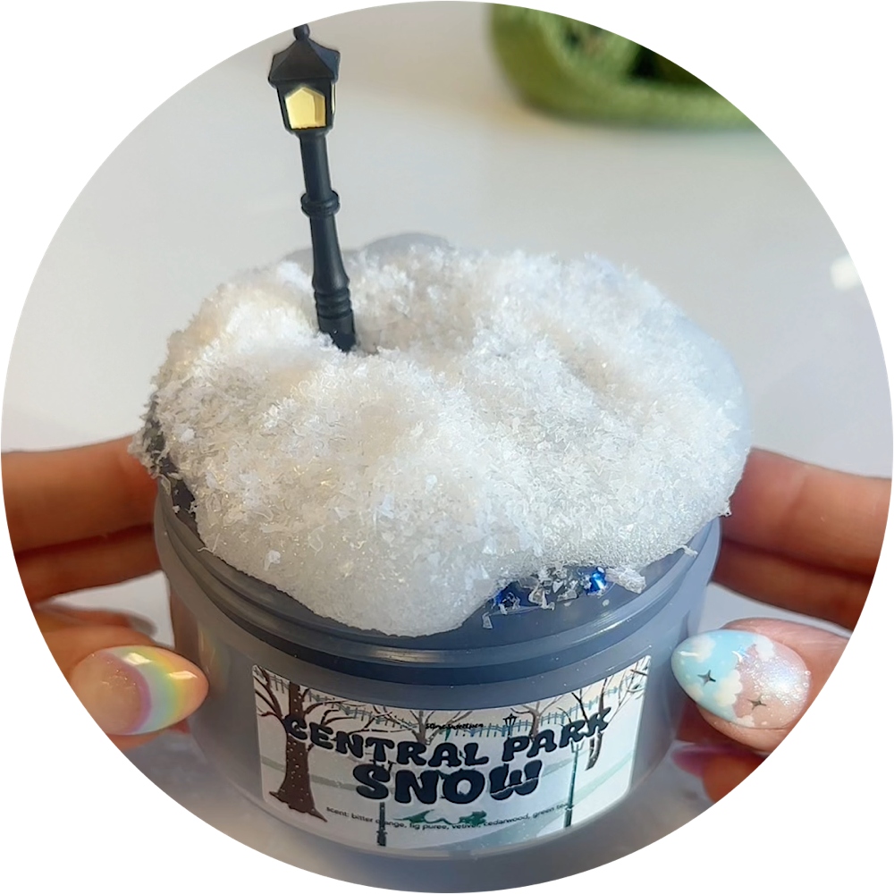 A loose, jiggly coated clear slime base with lava rocks and bingsu beads! Topped with a layer of jelly slime and soft fake snow to give the elusion of new york city's snowy ground.